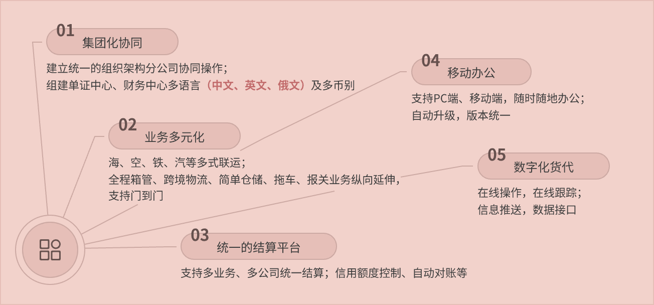 集团化协同、业务多元化、统一结算、移动办公、数字化货代。